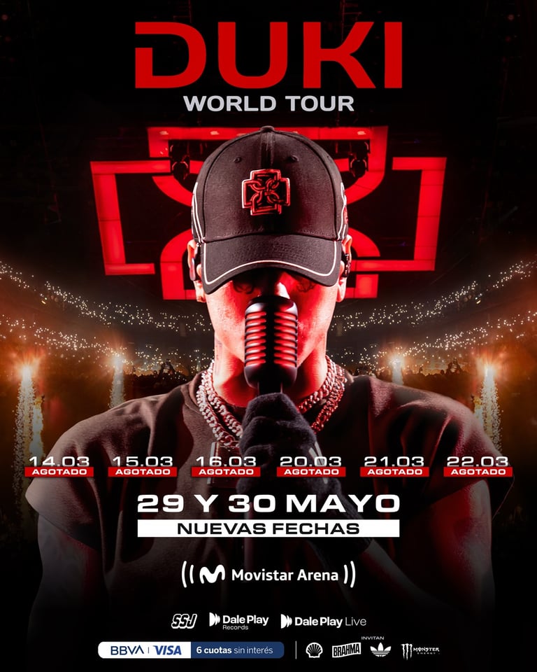 Tras el agotamiento total de sus seis fechas en el Movistar Arena, Duki sorprende con la incorporación de dos nuevas funciones para el 29 y 30 de mayo en el mismo recinto, reafirmando su increíble convocatoria y el fenómeno imparable que lo rodea.